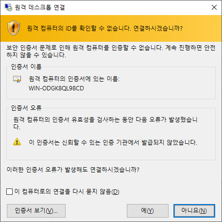 연결 시에는, 아래와 같이 인증서 오류 화면이 보이는데, 신경쓰지 말고 예(Y) 버튼을 클릭하면 연결됩니다.