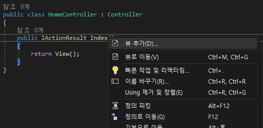 테스트를 위해 Index IActionResult에 뷰를 추가 해줍니다.