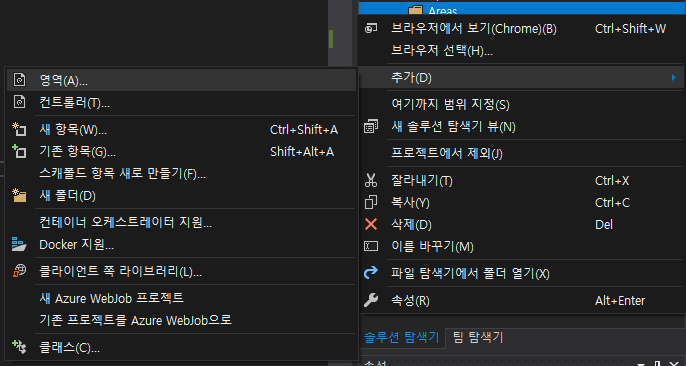 Areas 폴더에서 오른쪽 마우스 버튼을 클릭하고 나오는 추가 메뉴 영역에 들어가면, 이제서야 영역 (A) 추가 메뉴가 보이는 것을 확인 하실 수 있습니다.
