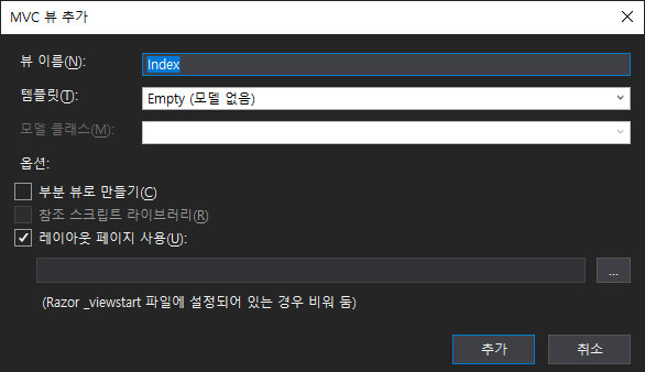 Index 라는 이름으로 View를 추가 합니다.