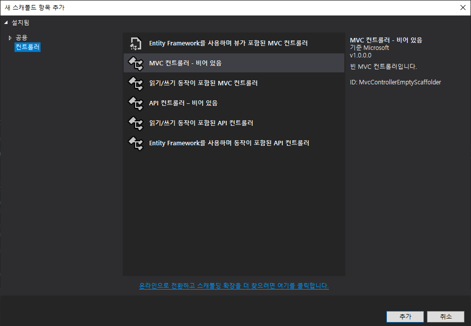Areas를 테스트 하기 위해 하나의 Controller를 추가해 줍니다.