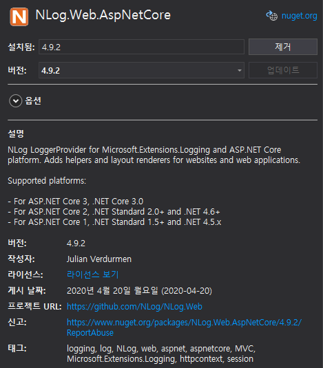 NLog 를 Nuget Package 관리자에서 검색하시면, 아래 AspNetCore 용 NLog를 발견하실 수 있습니다.