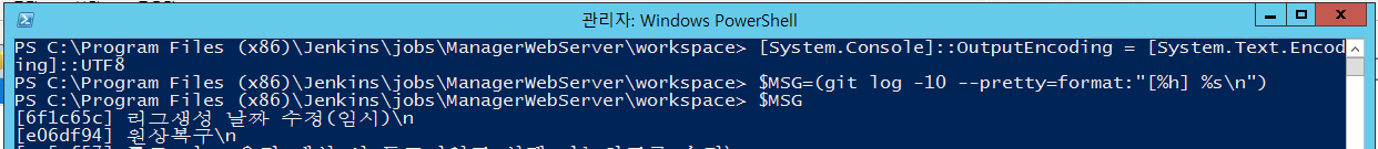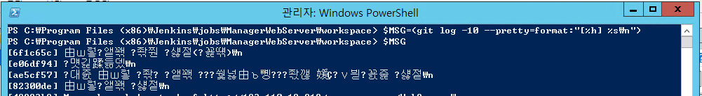 PowerShell의 변수에 git log 명령으로 나온 Text를 담게 되면, 여전히 Text는 깨지는 현상이 발생하였습니다.