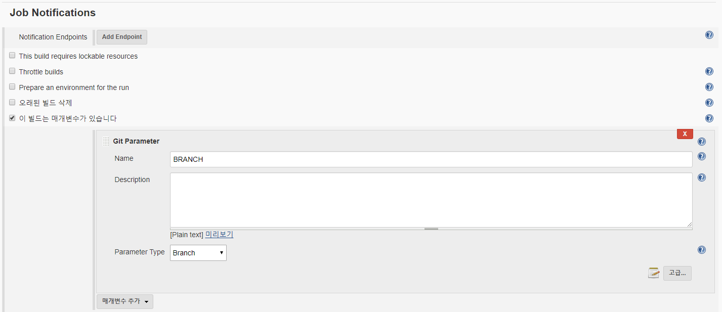 Jenkins의 Job Notifications 영역에 접근하면, 이 빌드는 매개변수가 있습니다 체크박스를 선택할 수 있습니다.