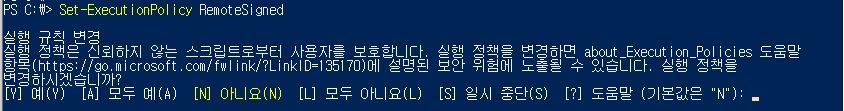 | RemoteSigned | 로컬 컴퓨터에서 본인이 생성한 스크립트만 실행 가능, 인터넷에서 다운로드받은 스크립트는 신뢰된 배포자에 의해 서명된 것만 실행할 수 있습니다. |