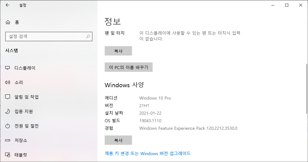 저의 경우는 Windows 10 Pro의 21H1 버전이네요.