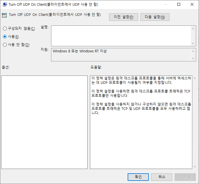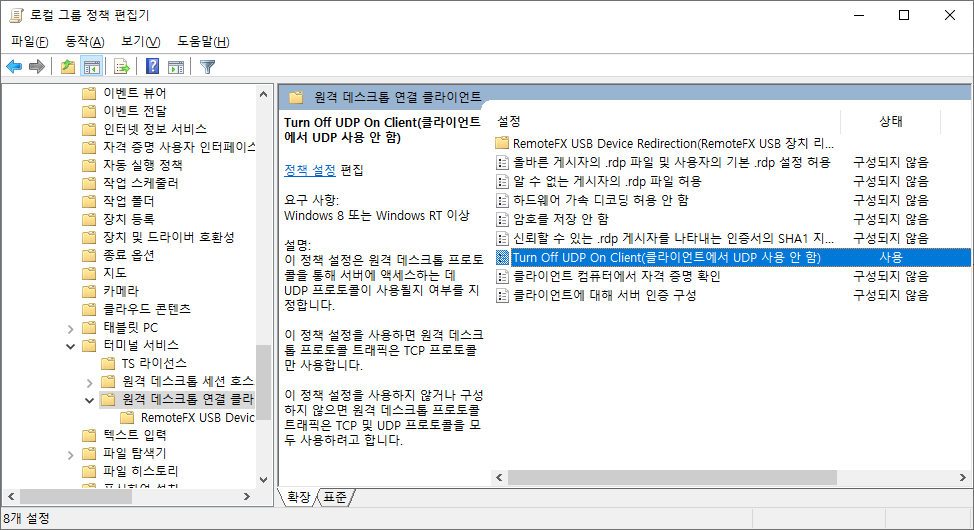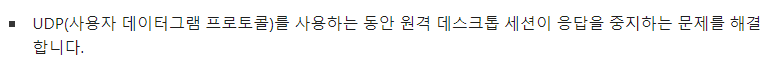 Windows 내 RDP v8 부터 UDP를 사용했는데, Windows 10의 특정 버전에서 TCP 와 UDP 프로토콜 사이를 원활하게 전환 할 수 없는 이슈가 있다고 합니다.