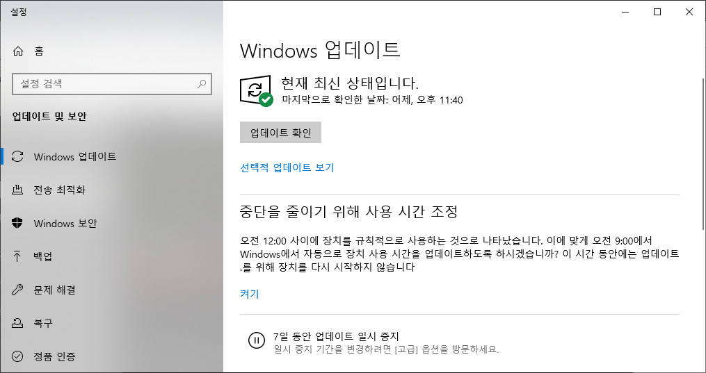 Windows 업데이트를 통해서 최신 버전으로 진행