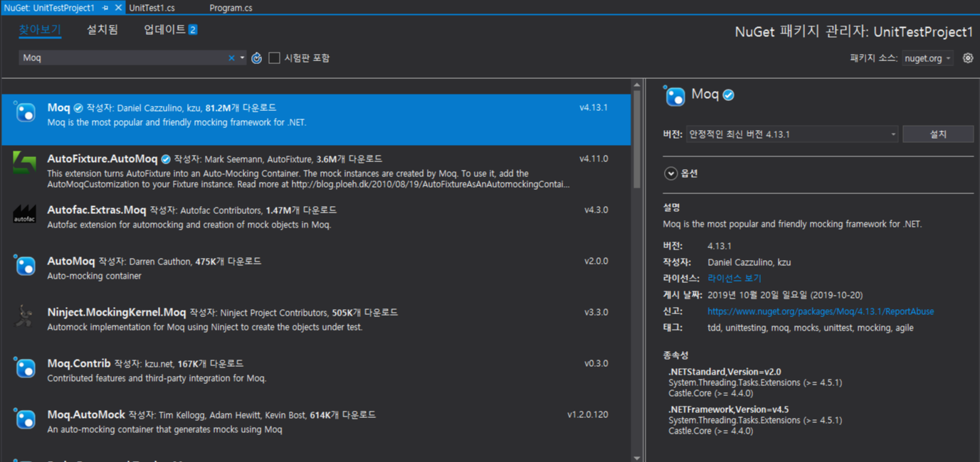 검색은 "Moq" 로 해주시면 됩니다.