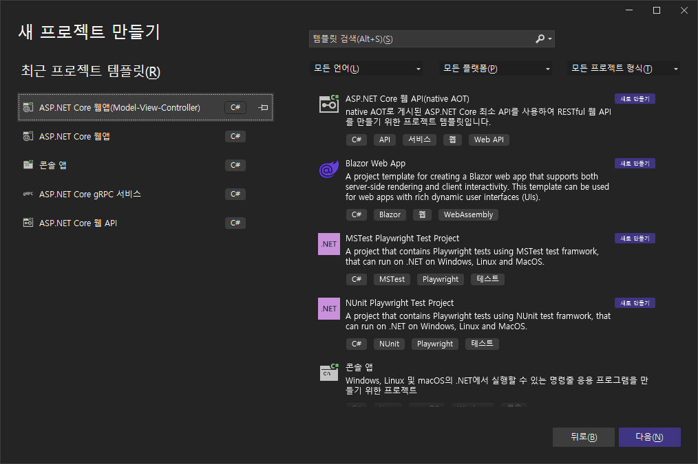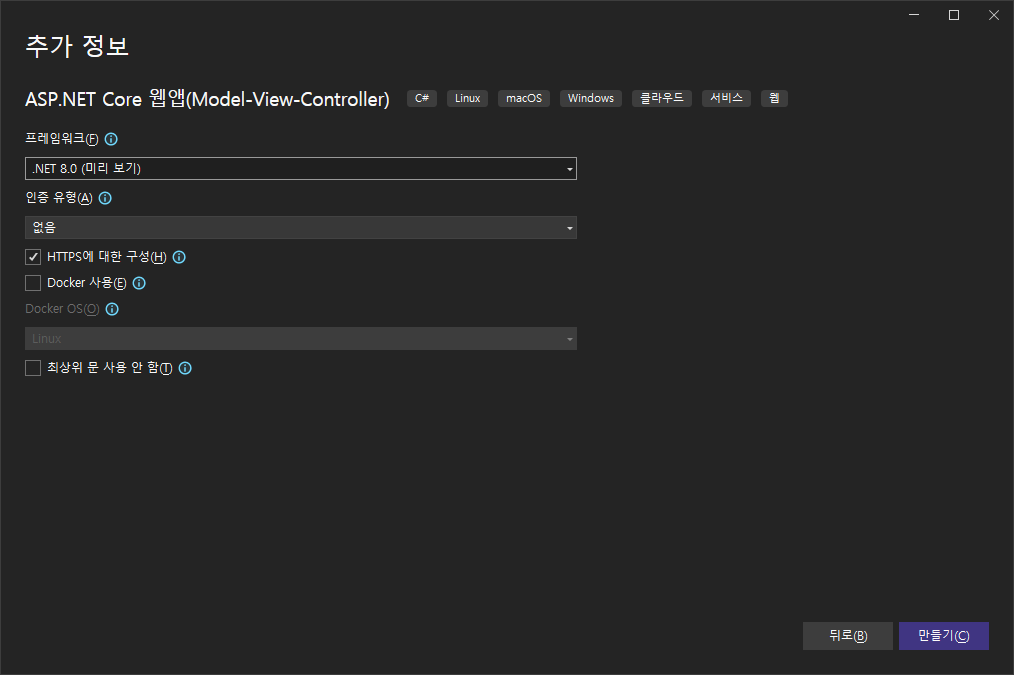 .NET 8.0 을 설치 한 후, ASP.NET Core 웹앱 (Model - View - Controller) 템플릿을 이용해서 프로젝트를 생성하였습니다.
