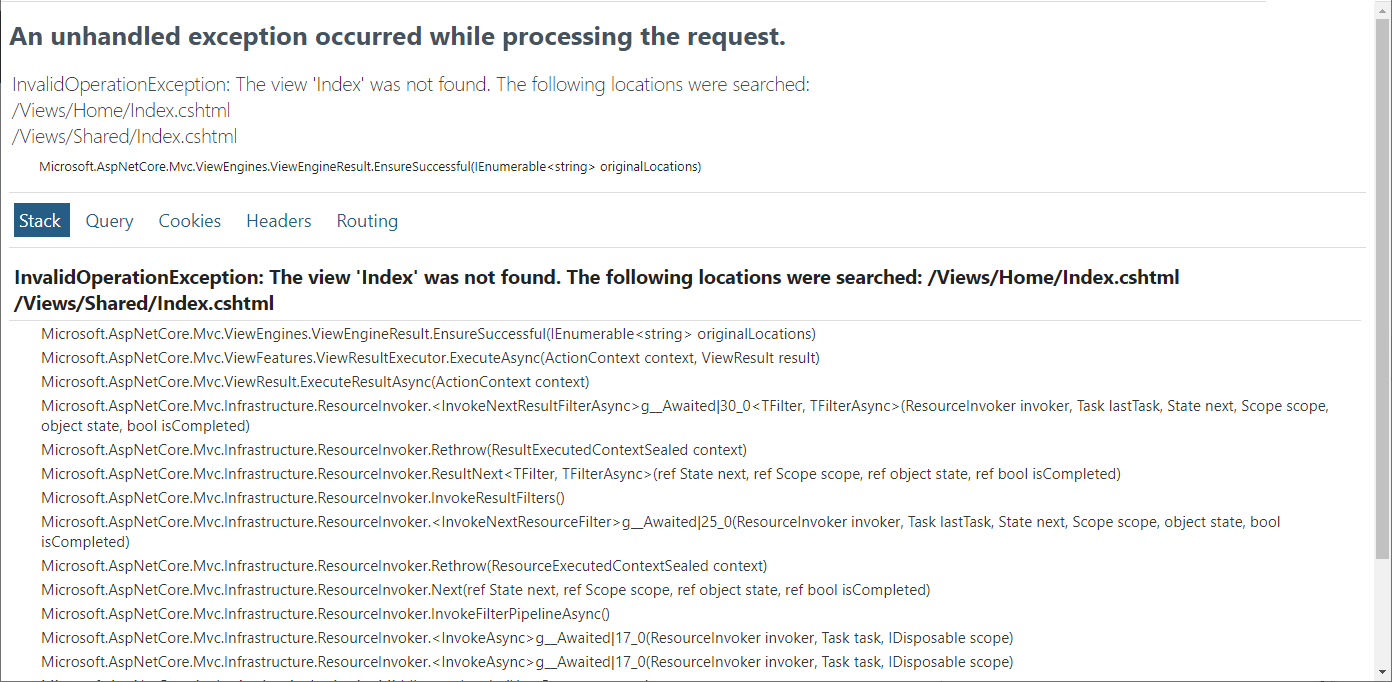 InvalidOperationException: The view 'Index' was not found. The following locations were searched: