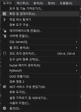 1. Visual Studio 설치 시 Market Place를 이용해서 설치 하였습니다. 도구 > 확장 및 업데이트 메뉴를 선택합니다.