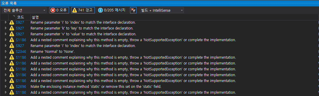 SonarLint를 적용시키고, 현재 진행중인 프로젝트에 적용했을때 보여지는 경고 리스트 입니다.