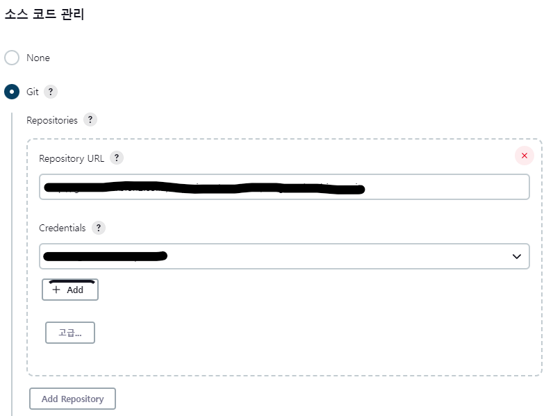 Git Parameter 에 사용할 Type 과 Name 이 정해졌다면, 소스 코드 관리 메뉴에서 Git 을 선택해서 기본적인 셋팅을 진행합니다.