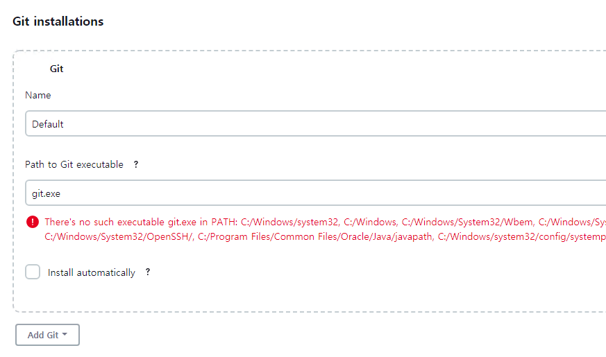 해당 메뉴에서 Git Intallations 메뉴에 접근 하니, 역시나 ! 느낌표가 발생되어 있는 상태였습니다.