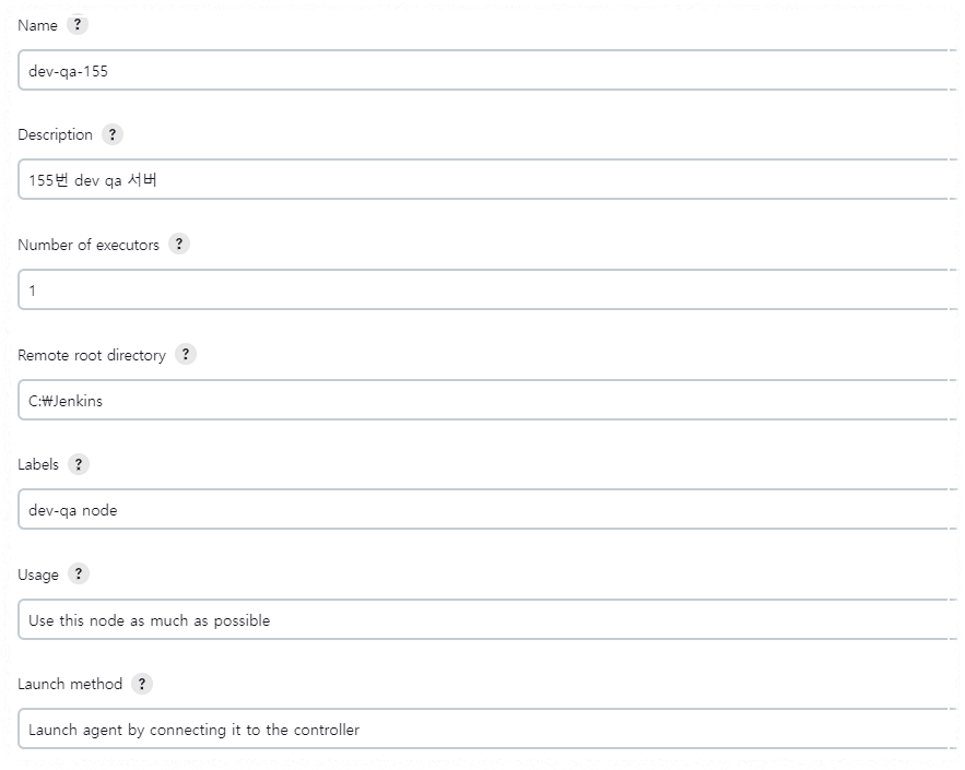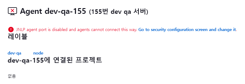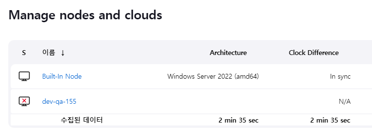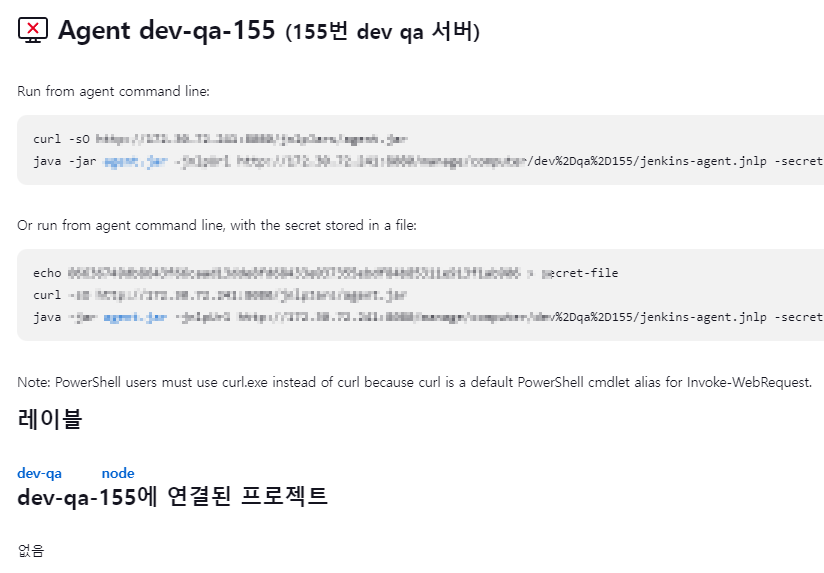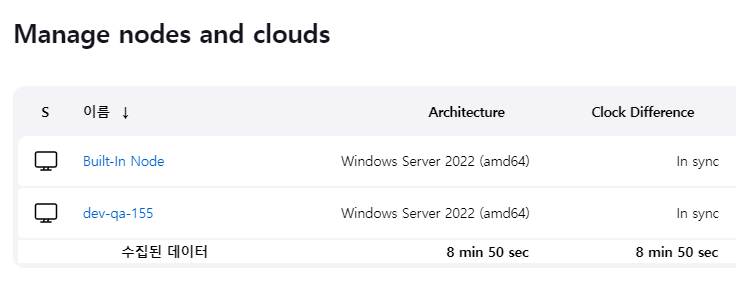 이후 dev-qa-155 이름의 sample Agent 노드에 정상적으로 연결이 된 것을 확인 할 수 있었습니다.