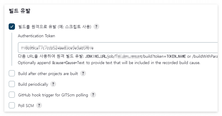 중간에 위치한 빌드 유발 설정 부분에 "빌드를 원격으로 유발" 을 선택해주고,