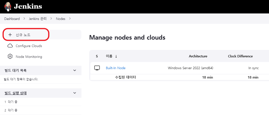 맨 위에 있는 Built-In Node는 젠킨스가 설치된 서버의 노드이기 때문에 무시하셔도 됩니다.