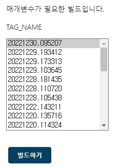 이제 프로젝트의 빌드 버튼을 선택할 경우, 아래와 같이 Tag 이름이 보여지게 되며, 해당 Tag를 선택 후 빌드버튼을 누를경우, Tag로 빌드가 됩니다.