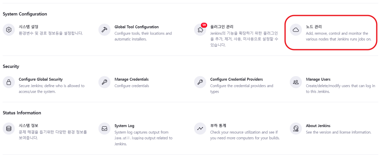 Jenkins 관리 메뉴에서 노드관리 메뉴를 선택합니다.