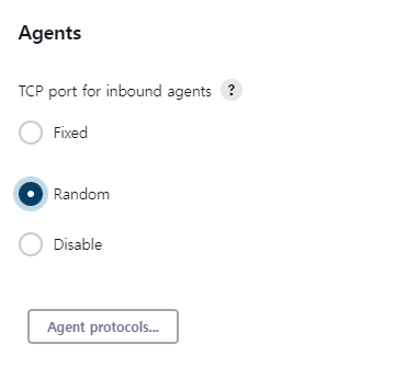 인바운드 에이전트를 사용하지 않는 경우 기본 설치 동작인 이 기능을 완전히 비활성화하는 것이 좋습니다. Jenkins는 TCP 포트를 사용하여 인바운드에 연결된 에이전트와 통신합니다. 인바운드 에이전트를 사용하려는 경우 시작 시 시스템이 임의로 포트를 선택하도록 허용할 수 있습니다(이렇게 하면 다른 Jenkins 인스턴스를 비롯한 다른 프로그램을 방해하지 않습니다). 방화벽은 임의의 포트를 보호하기 어렵기 때문에 대신 고정 포트 번호를 지정하고 그에 따라 방화벽을 구성할 수 있습니다.