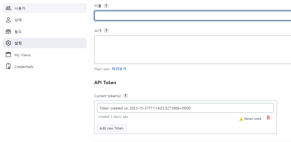 해당 API 토큰은, 유저를 관리하는 메뉴에서 해당 프로젝트에 권한이 있는 계정에 설정 메뉴에서 만드실 수 있습니다.
