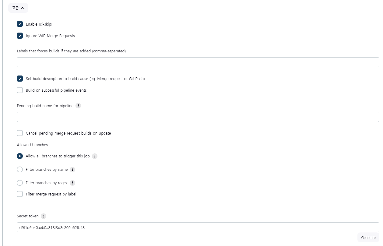 이때 Generate 버튼을 클릭하면, 문자열이 생성이 되는데요. 이 값도 GitLab 설정시 필요한 값이니 적어둡니다.