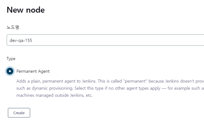 노드명을 입력해주고, Type은 Permanent Agent 를 선택해 줍니다.