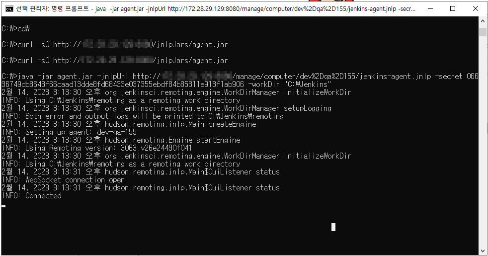 이처럼 관리자 모드로 cmd를 실행 후, 해당 명령어를 입력하게 되면, jar 파일을 다운로드 받고 해당 파일을 이용해서 WebSoket을 이용해서 연결 한 것을 확인 할 수 있습니다.