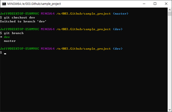 브런치 간의 Switch를 하기 위해서는 checkout 이라는 명령어를 이용한다.
