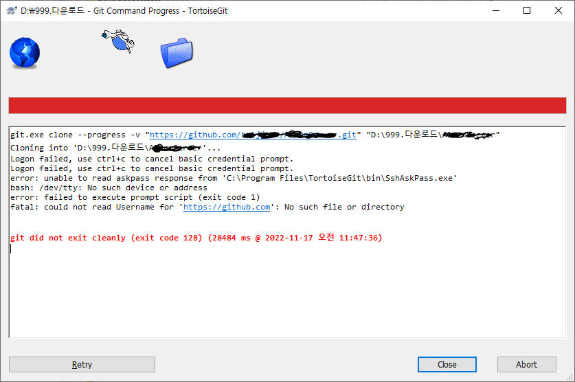 개인적인 프로젝트의 경우에는 Github를 이용해서 git Repository를 구성해서 사용하고 있습니다. 한동안 사용을 못하고 있다가 오랜만에 github 프로젝트를 접근 했었는데요. Site 상에서는 로그인이 정상적으로 진행이 되는데, 저장소 pull 을 땡기면, failed to excute prompt script (exit code 1) 오류가 발생해서 한참을 검색했는데요.