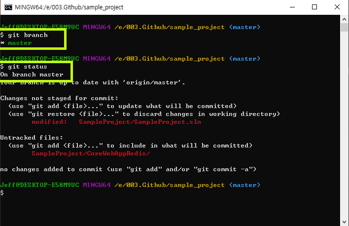 또한 아래의 명령어를 이용하면, 현재 내가 어떤 branch 에 있는지 확인이 가능하며, git bash util을 이용하면, <master> 중괄호안에 현재 branch를 명시해 주기도 합니다.