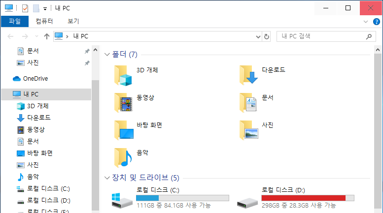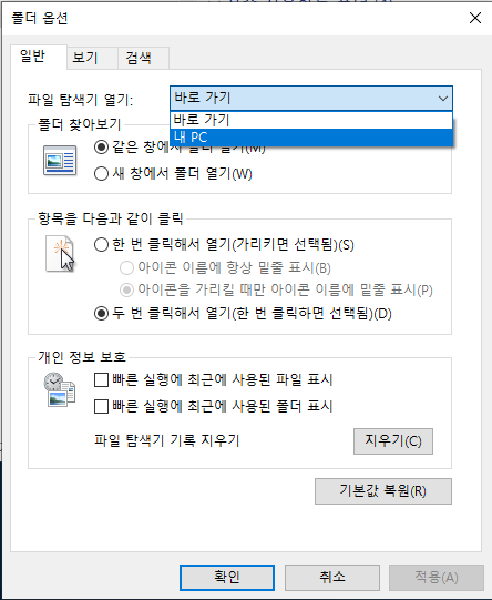 개인 정보 보호는 파일 및 폴더에 대한 표시만 제어 해 줄 뿐 윈도우 탐색기를 처음 열었을때, 바로가기 화면이 나오는 것은 유지된다. 이를 내 PC (디스크 화면) 로 선택해 주면, 윈도우 탐색기를 열었을때, 아래 화면이 나타나게 된다.