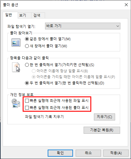 옵션 메뉴에 접근하게 되면, 일반 탭의 개인 정보 보호 영역이 보인다.
