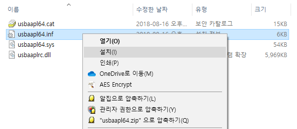 위 경로로 진입하시면, usbaapl64.inf 해당 파일을 찾으실 수 있습니다.