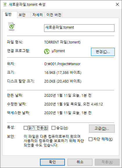 해당 속성에 들어가게 되면, 연결 프로그램이 uTorrent 로 되어 있는 것을 보실 수 있습니다.