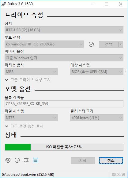 그리고 시작 버튼을 클릭해주면, USB 부팅디스크가 만들어집니다.