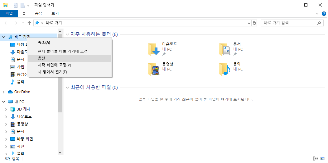 자주사용하는 폴더 및 최근에 사용한 파일이 첫 화면 "바로가기" 영역에 나타나는걸 볼 수 있다.