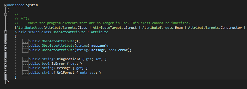 이때 사용하기 좋은 특성 중 에 하나가 [Obsolete] 입니다.
