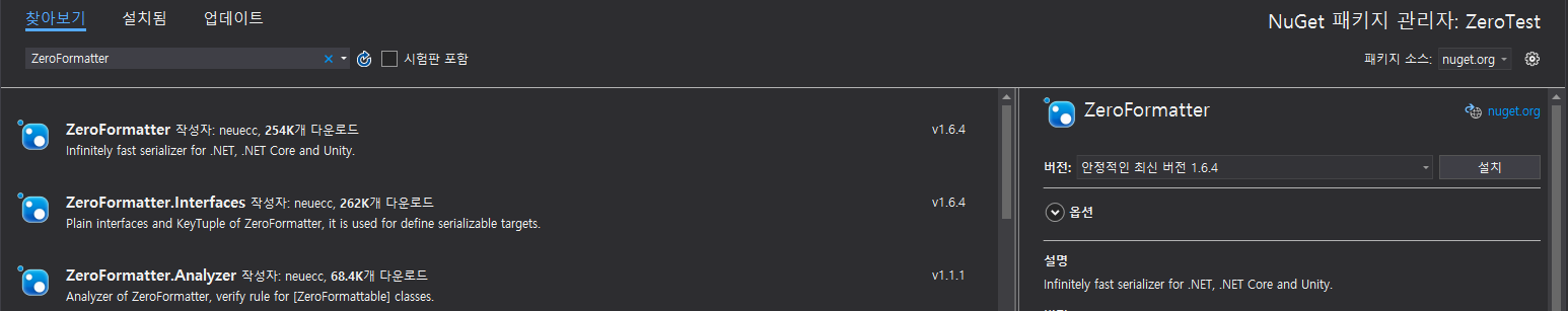 가장 상단에 있는 ZeroFormatter를 설치합니다.