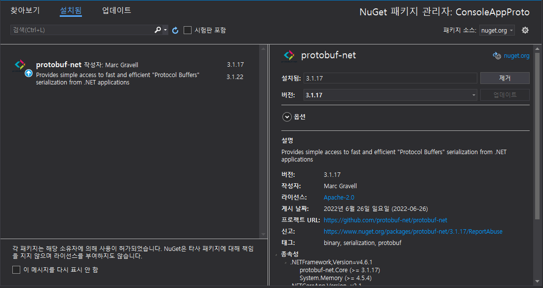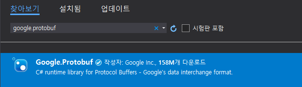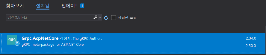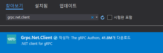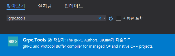 클라이언트 프로젝트의 경우에는 Grpc.Tools 가 따로 포함이 되어 있지 않기 때문에 Nuget.Package 에서 위 내용을 검색 후 설치해 주시면 됩니다.