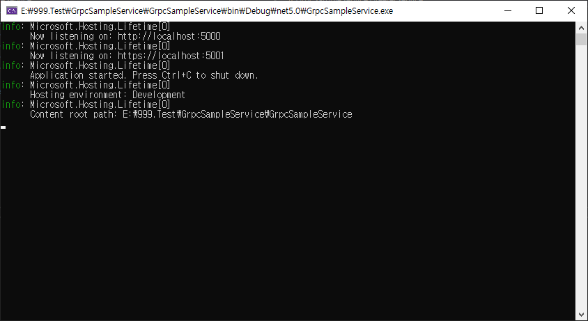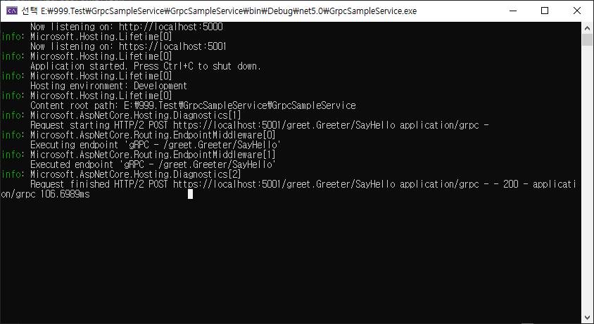 클라이언트 코드는, gRPC 서버에 SayHello Method를 호출하도록 구성하였으며, Request 로 "GreeterClient" 를 인자로 넘기도록 구성된 샘플 코드를 사용하였습니다.