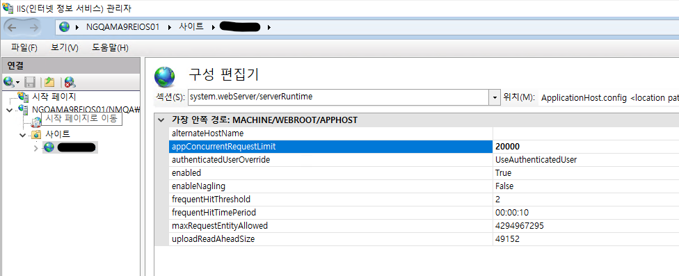 해당 메뉴에서 구성편집기의 system.webServer/serverRuntime 섹션의 appConcurrentRequestLimit 수를 기본값 5000 에서 20,000 으로 수정하였습니다.