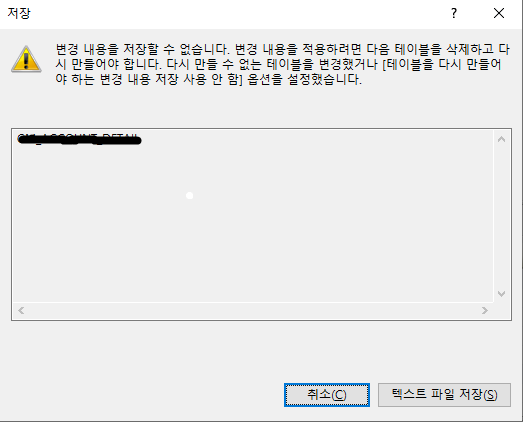 이러한 사항은 테이블을 다시 만들어야 하는 변경 내용 저장 안함 옵션을 사용할때 발생 합니다.